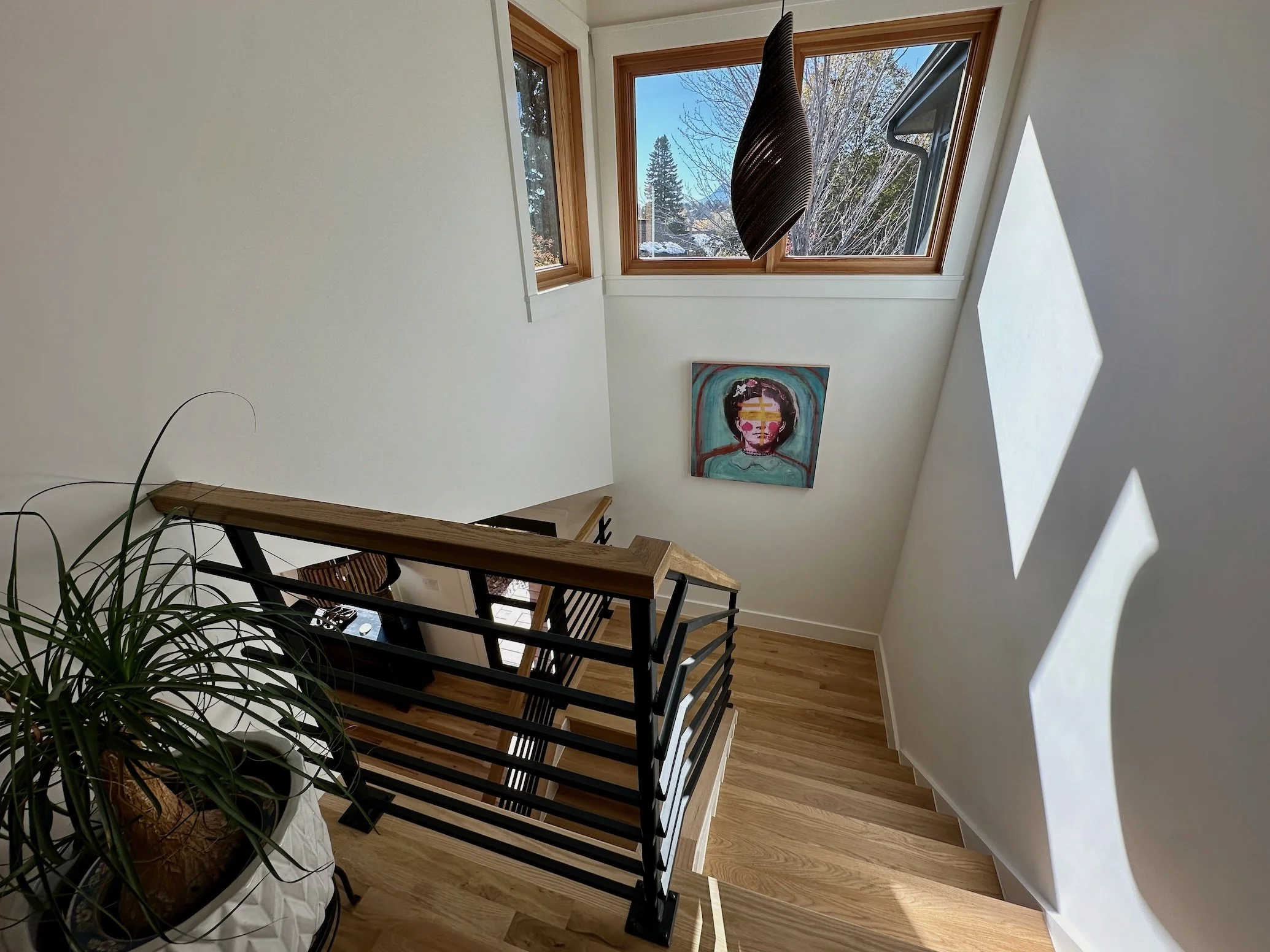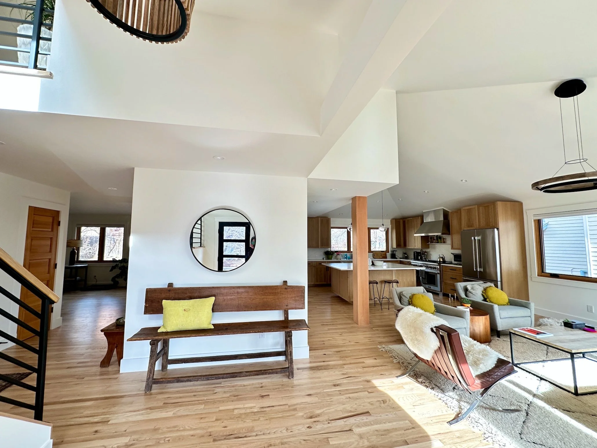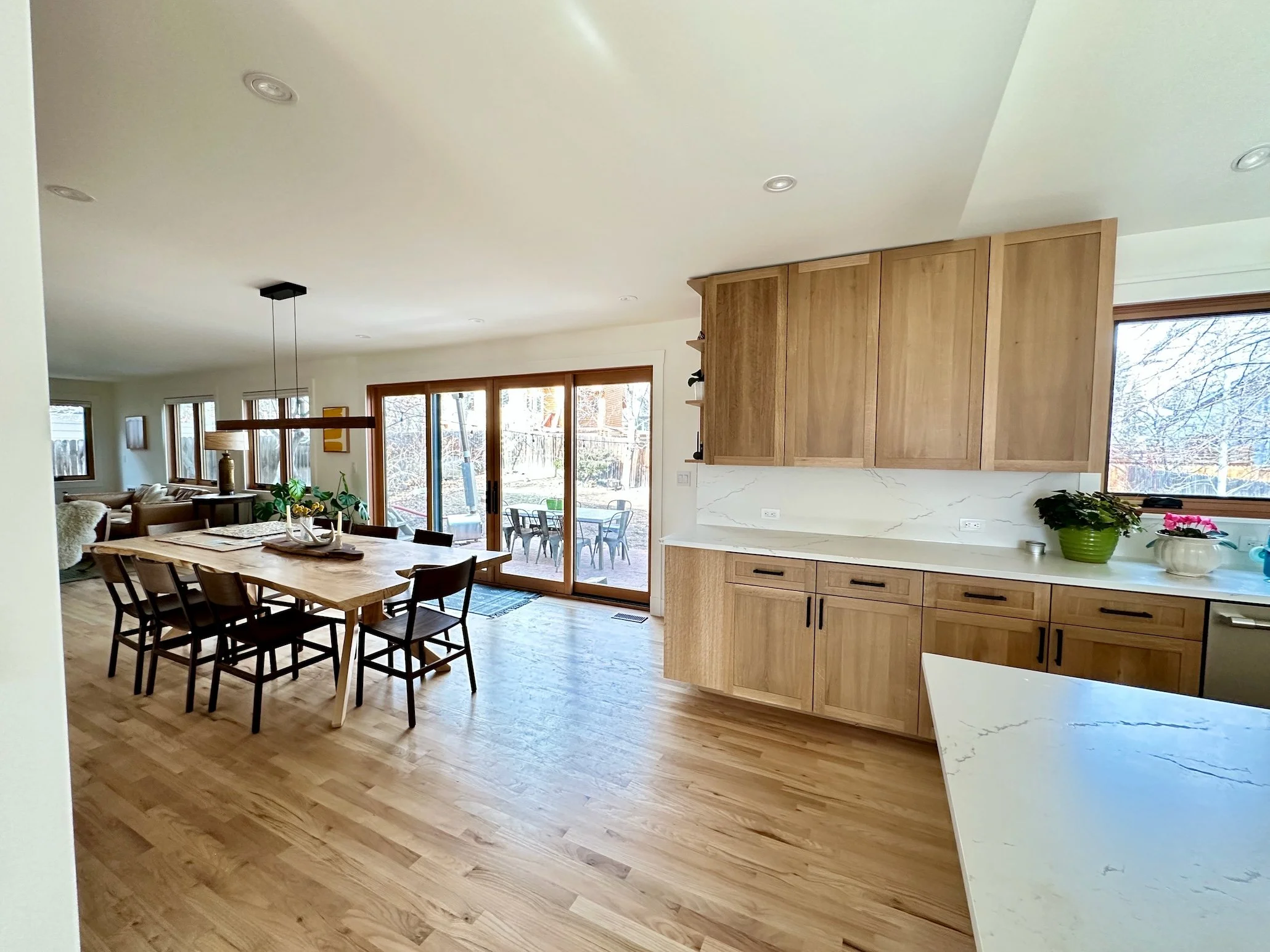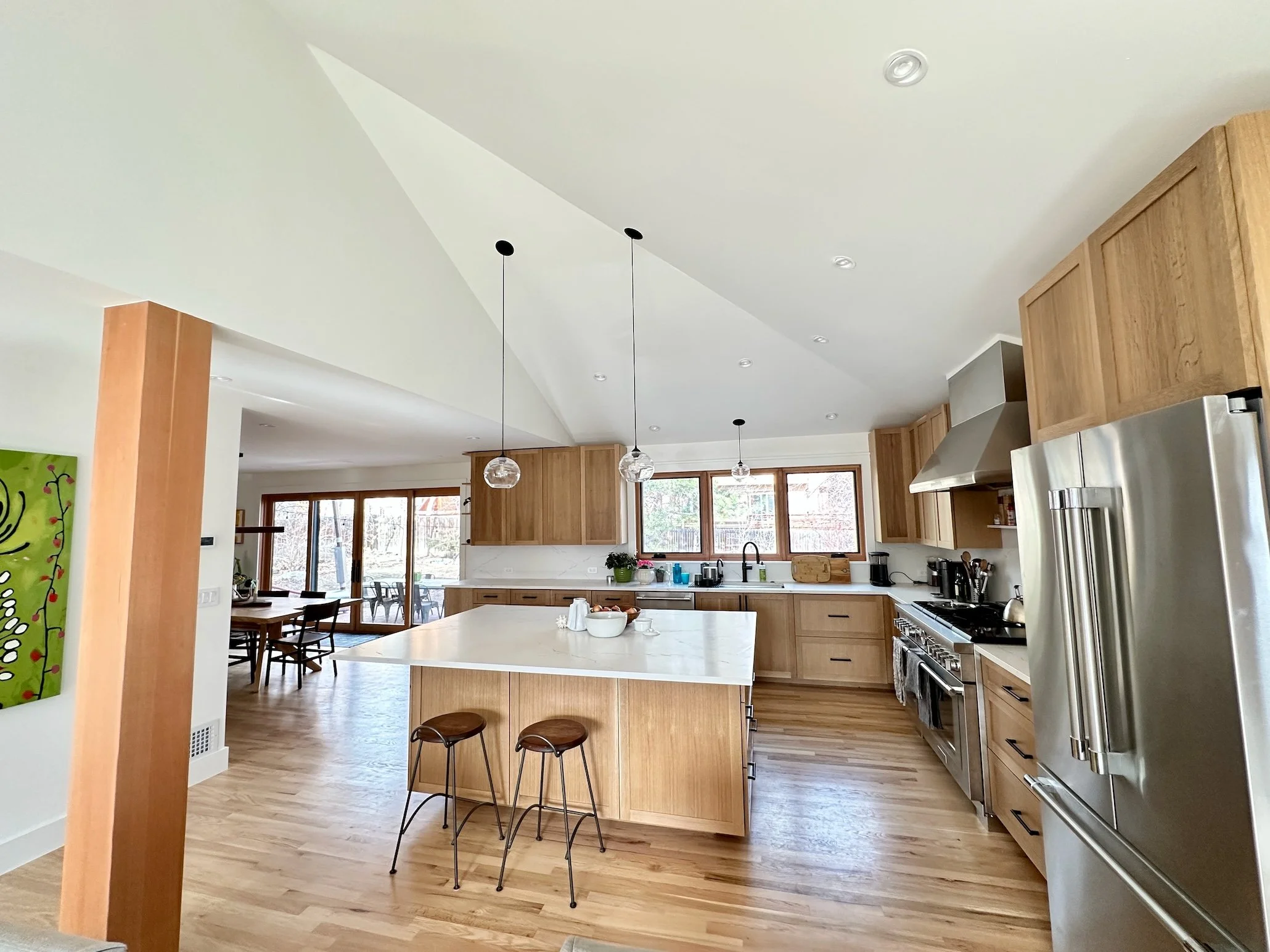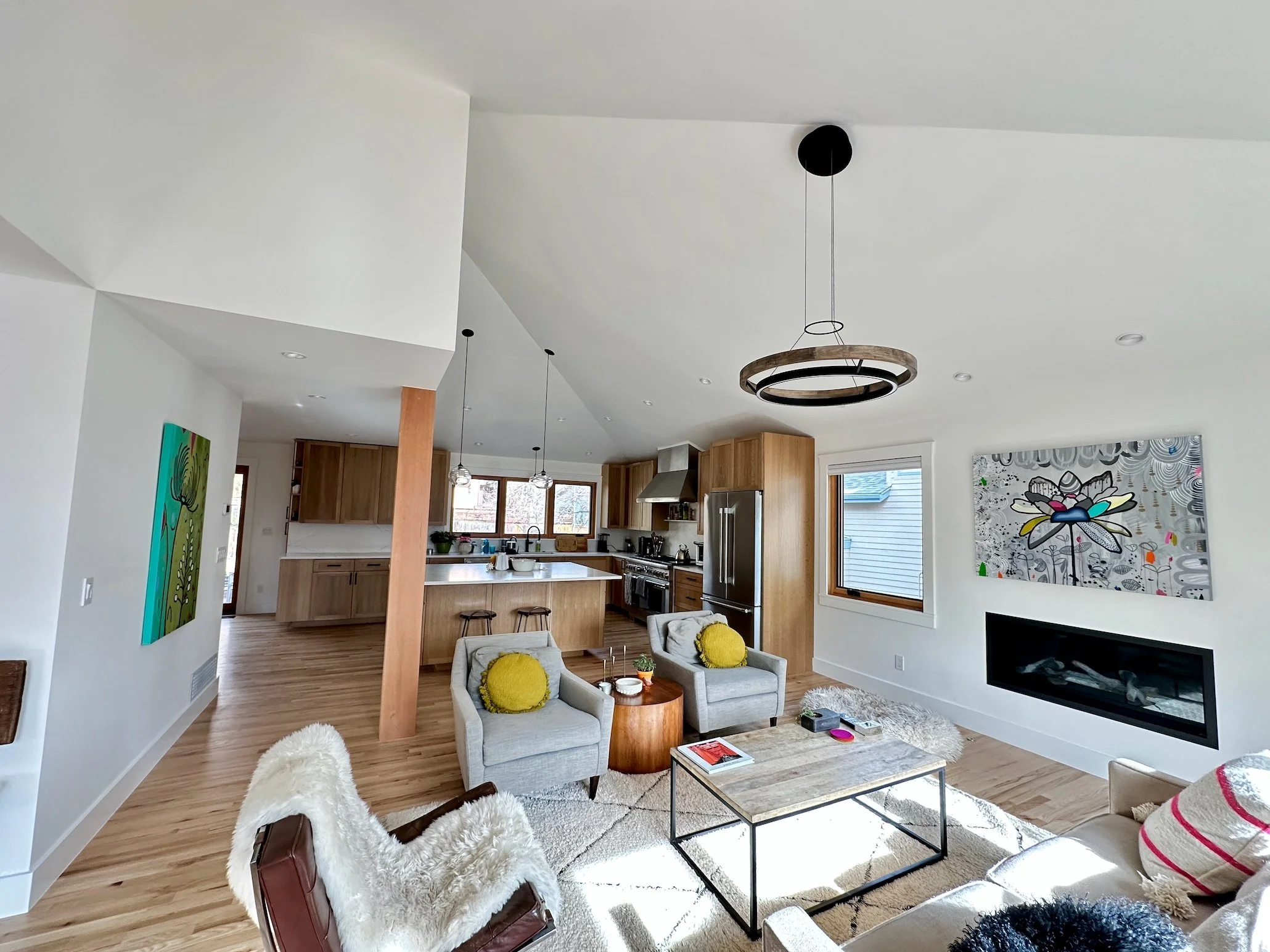 This 27-year-old family home was revitalized, combining modern aesthetics with practical upgrades. The dated exterior was streamlined by replacing and reconfiguring windows to maximize natural light, swapping cedar siding for fire-resistant cement board, and removing unnecessary features like the bay window, primary bedroom dormer, bathroom bump-out, and brick veneer accents. Inside, the layout was modernized with an open-concept main floor, vaulted ceilings, and a gourmet kitchen featuring rift-sawn white oak cabinetry. Three bathrooms, including the primary, were fully updated for improved flow and functionality.