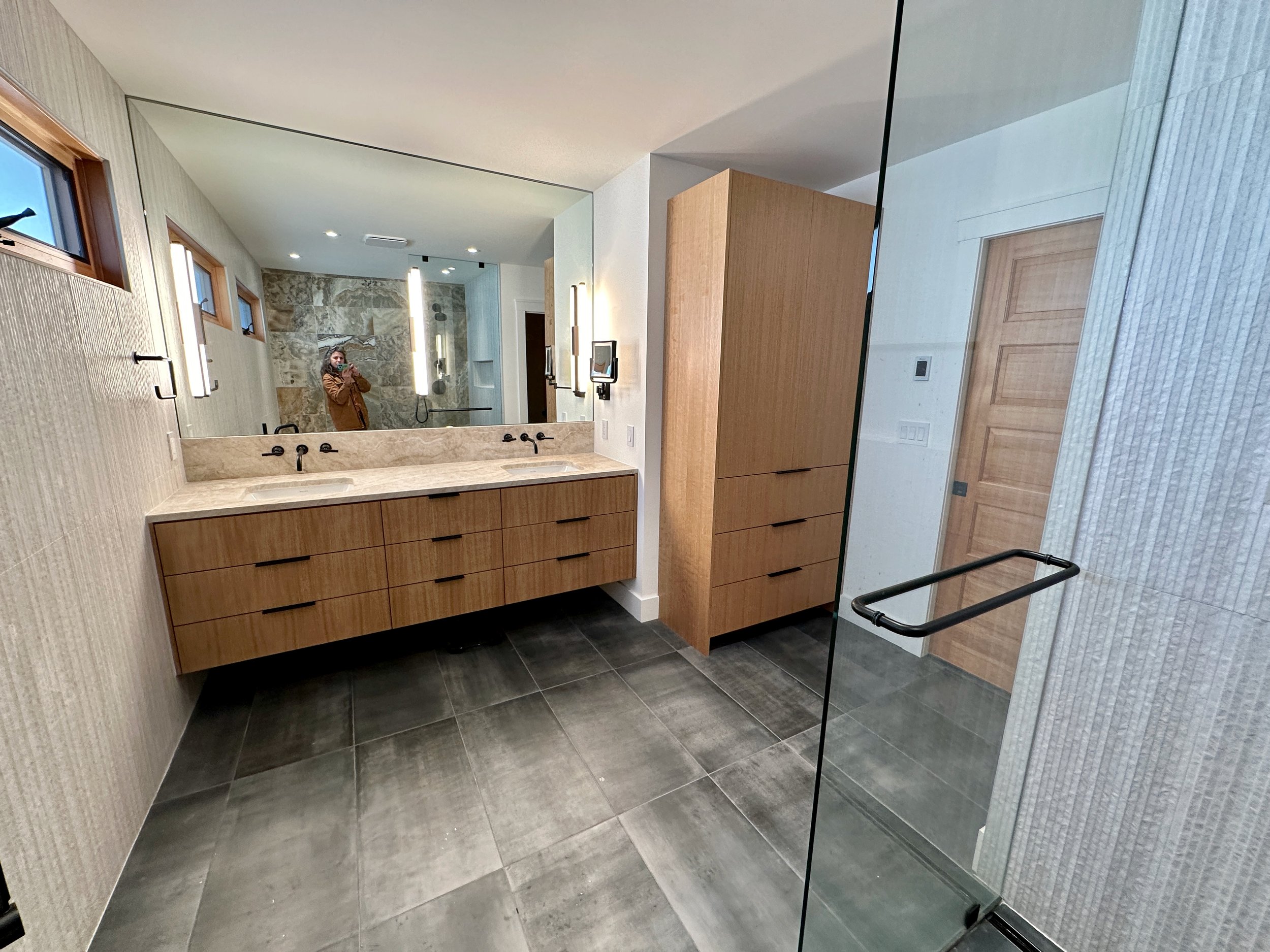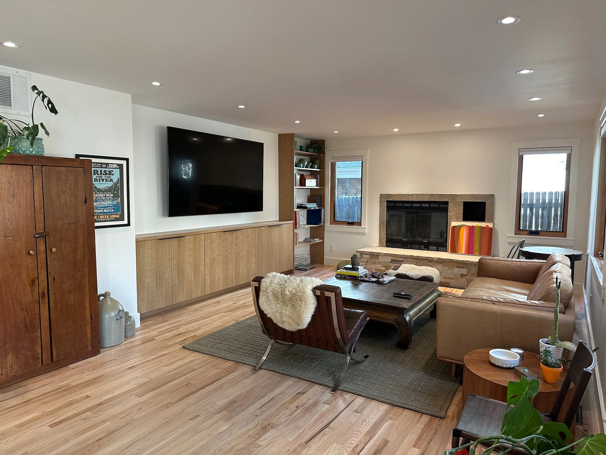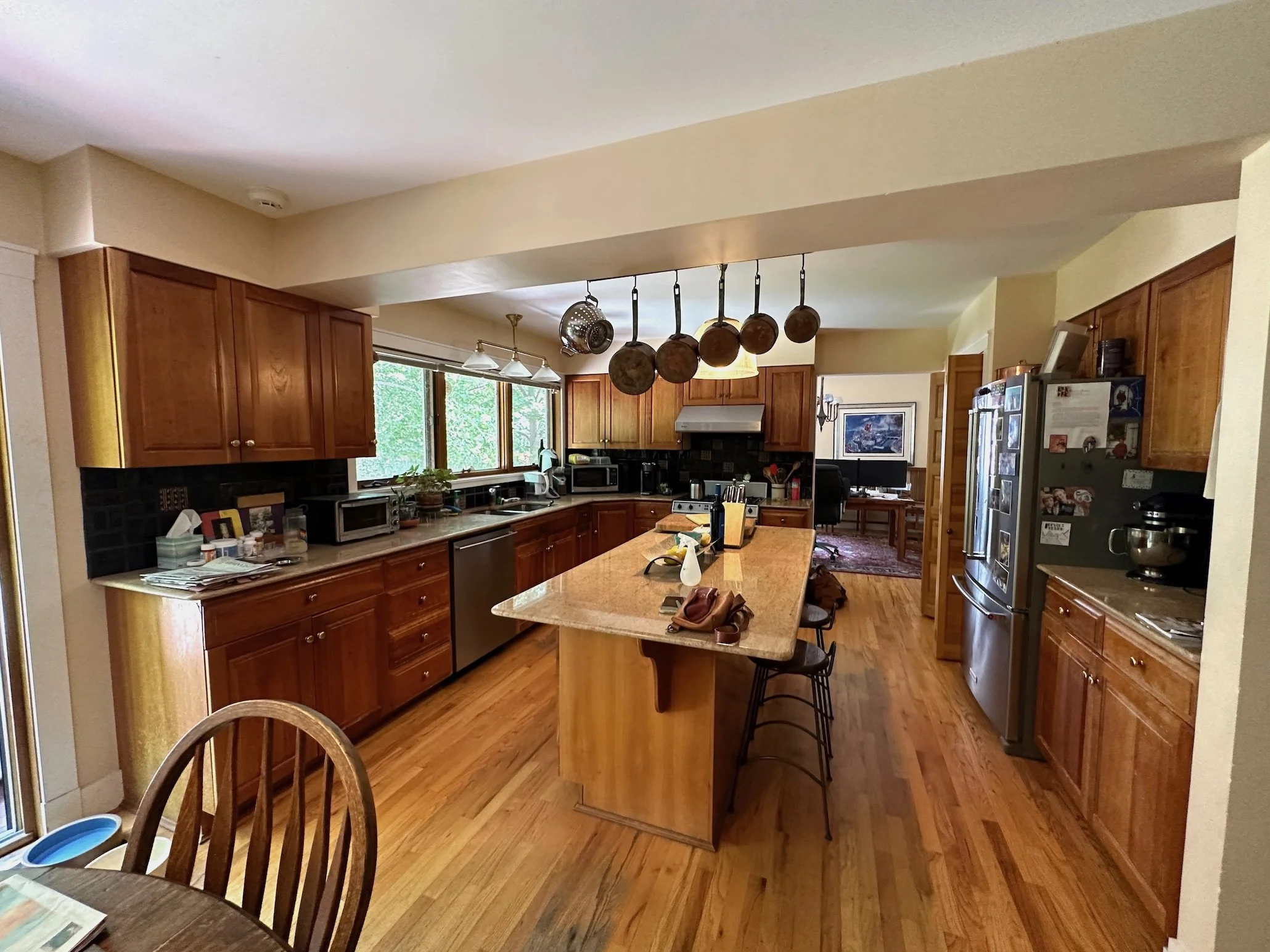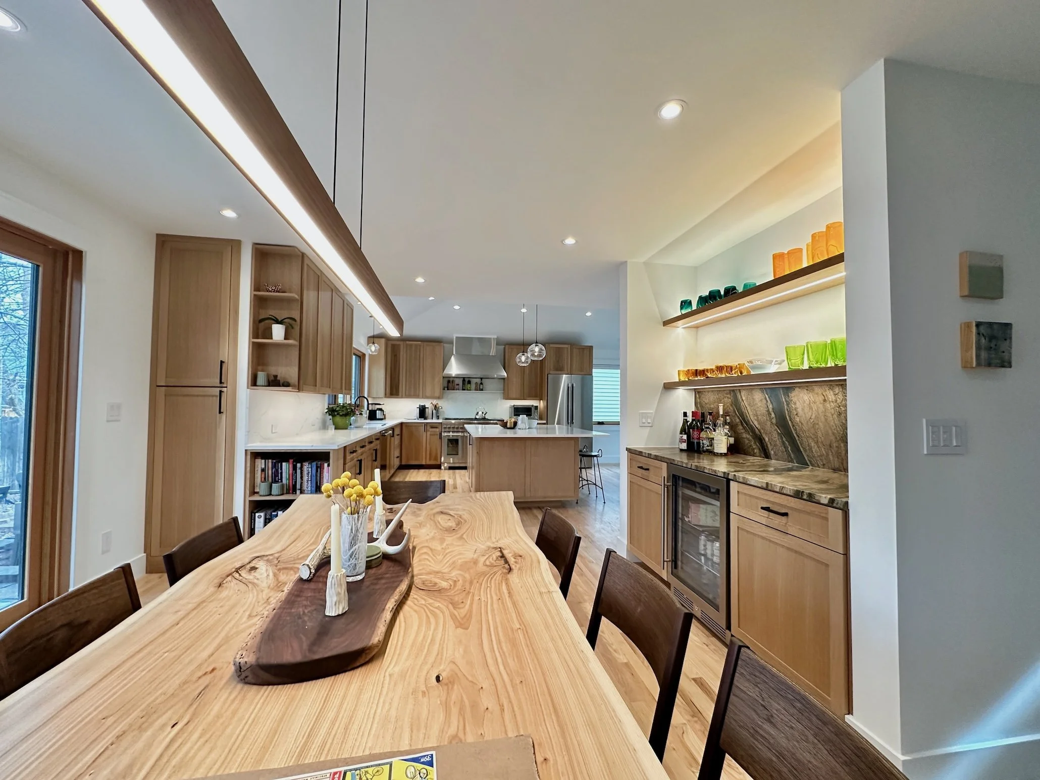 This 27-year-old family home was revitalized, combining modern aesthetics with practical upgrades. The dated exterior was streamlined by replacing and reconfiguring windows to maximize natural light, swapping cedar siding for fire-resistant cement board, and removing unnecessary features like the bay window, primary bedroom dormer, bathroom bump-out, and brick veneer accents. Inside, the layout was modernized with an open-concept main floor, vaulted ceilings, and a gourmet kitchen featuring rift-sawn white oak cabinetry. Three bathrooms, including the primary, were fully updated for improved flow and functionality.