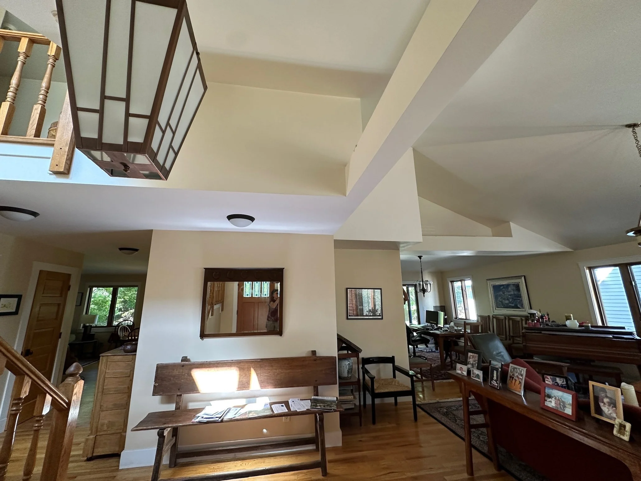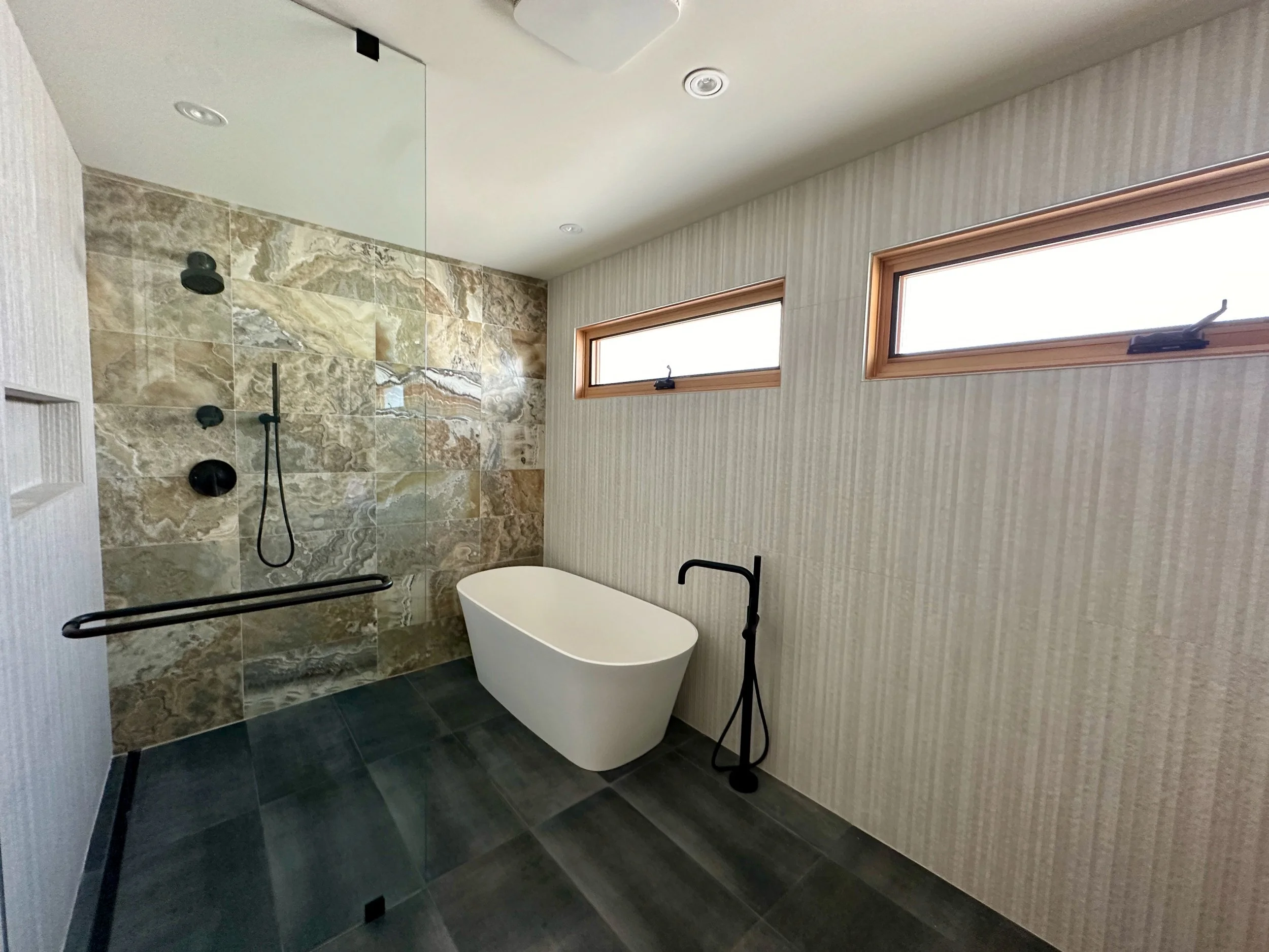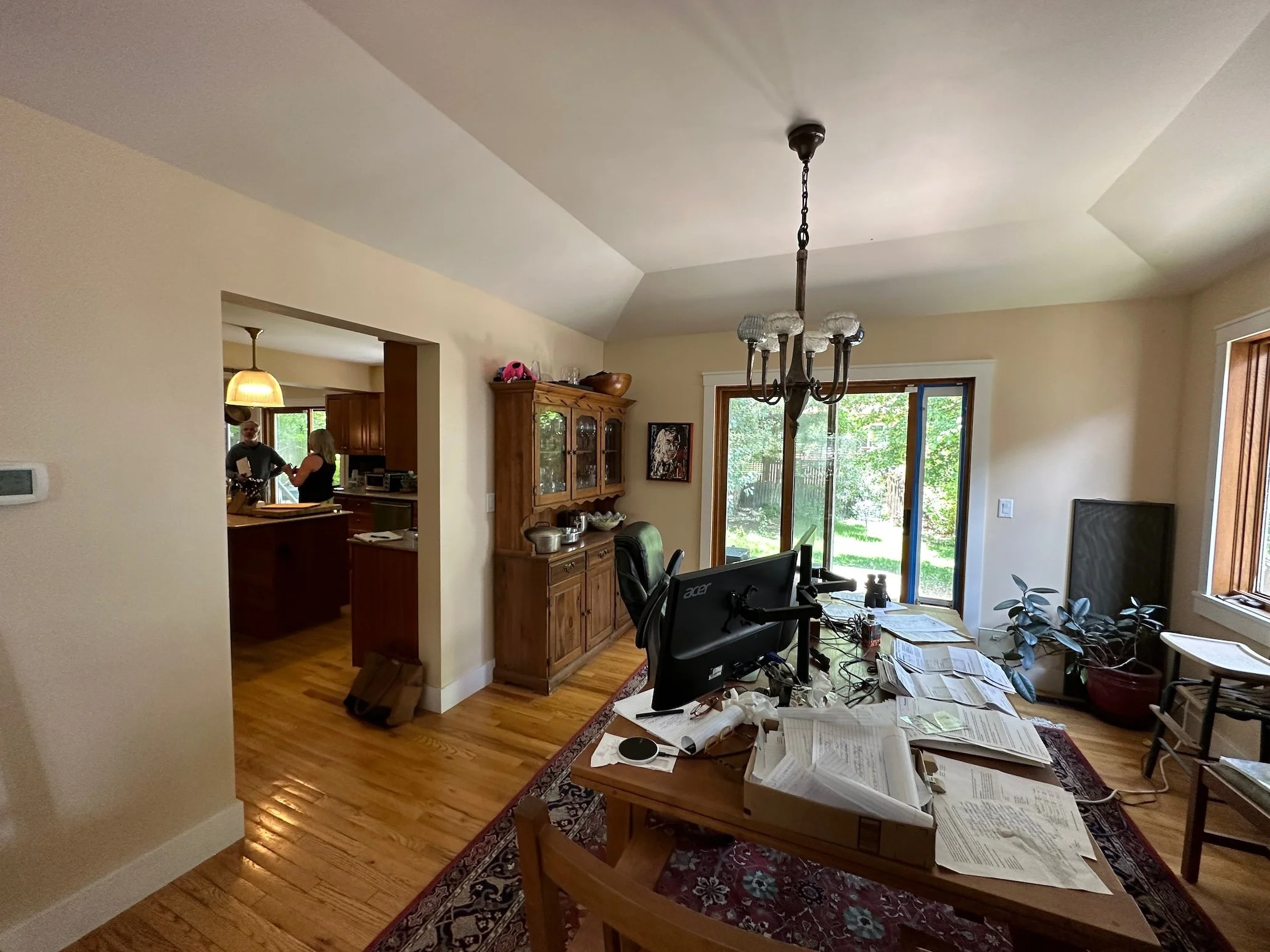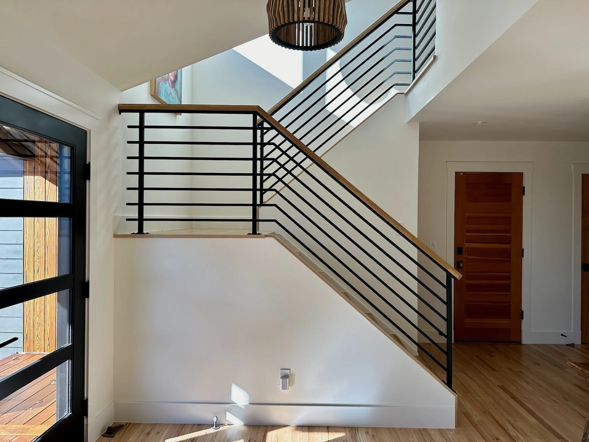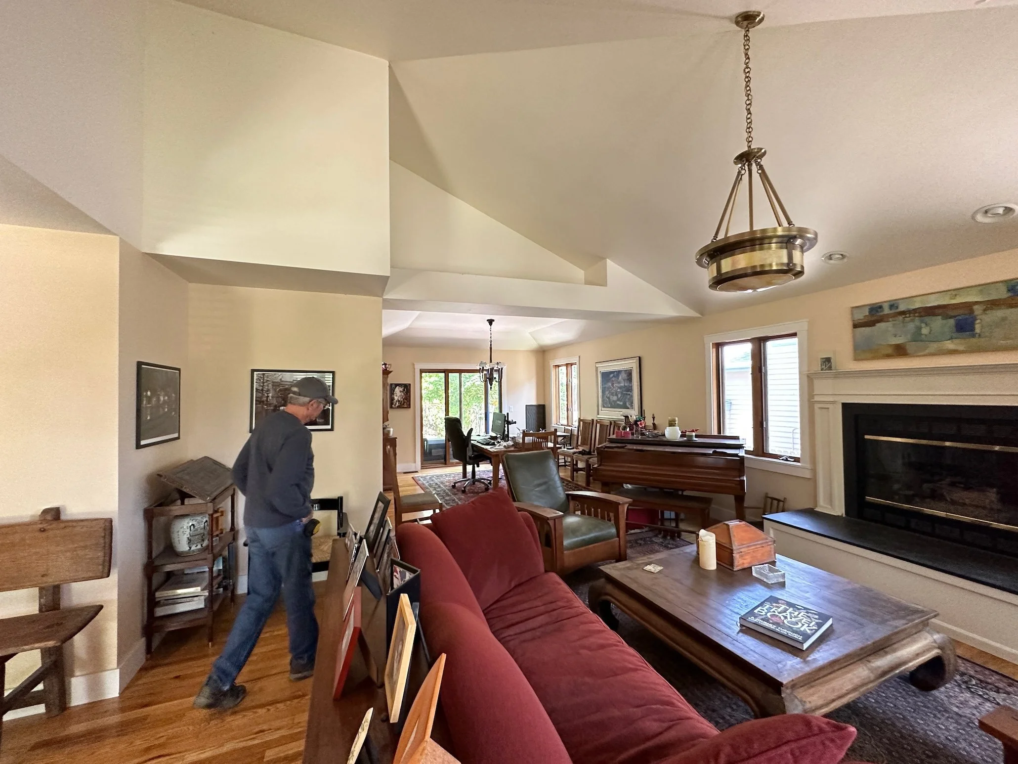 This 27-year-old family home was revitalized, combining modern aesthetics with practical upgrades. The dated exterior was streamlined by replacing and reconfiguring windows to maximize natural light, swapping cedar siding for fire-resistant cement board, and removing unnecessary features like the bay window, primary bedroom dormer, bathroom bump-out, and brick veneer accents. Inside, the layout was modernized with an open-concept main floor, vaulted ceilings, and a gourmet kitchen featuring rift-sawn white oak cabinetry. Three bathrooms, including the primary, were fully updated for improved flow and functionality.